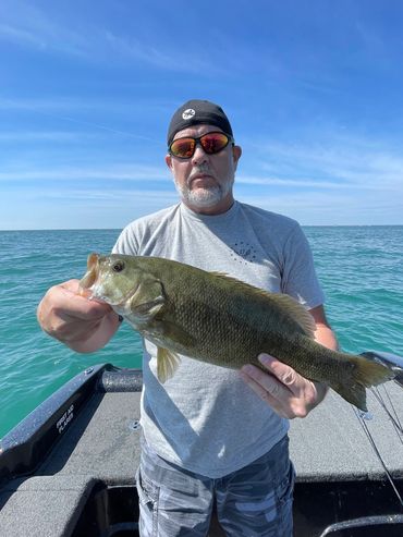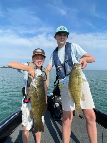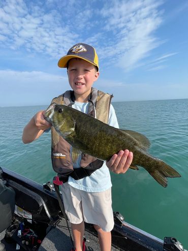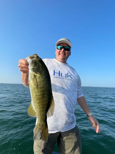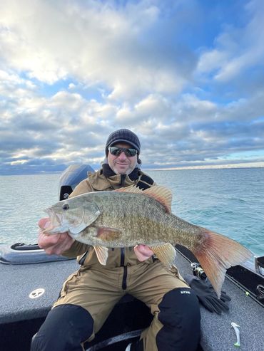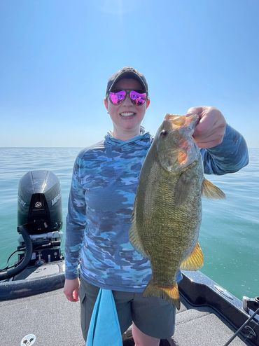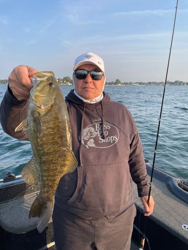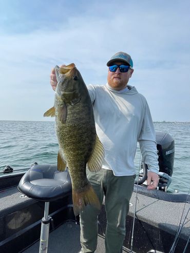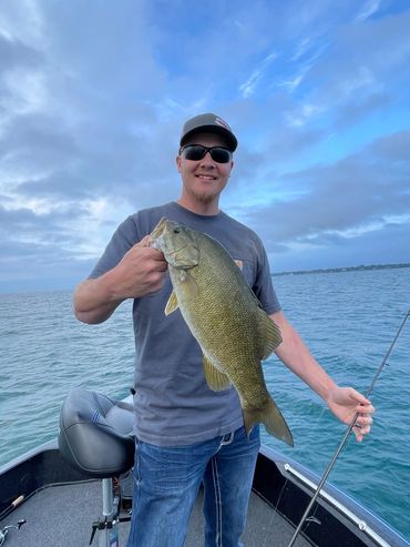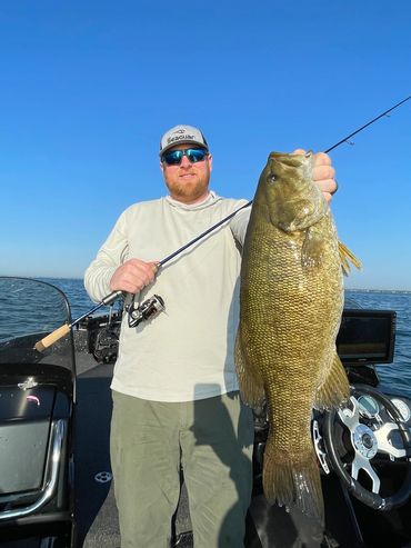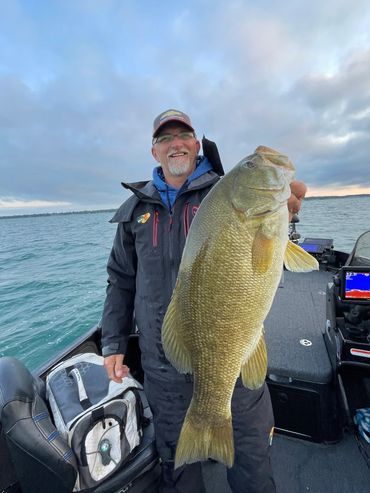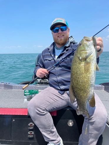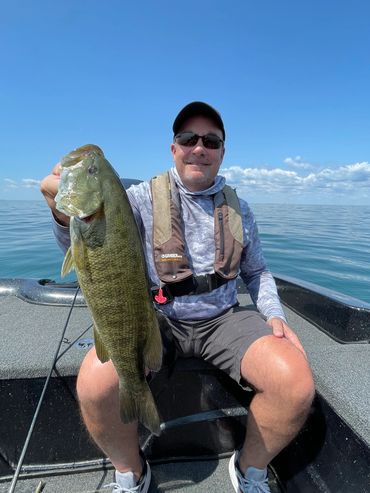 The weather to start the month of June was absolutely beautiful. We began with several warm, calm days and with the stable conditions the spawn peaked and there were fish everywhere. The mornings started out with great top water action catching Smallmouth and a few bonus Largemouth. The best bait choices were the trusty Pop-R or Sammie with a slow retrieve working them across shallow flats that had actively spawning fish and fish that had finished spawning but were still shallow feeding up. Once the wind picked up we were able to find bedding fish and pick them off with a Poor Boys Darter Jr rigged on a drop shot. If the conditions didn't allow us to sight fish we covered water by fan casting a drop shot or a grub. Both the single tail and double tail grub caught fish however, it seemed like day to day they would prefer one over the other. The end of the month brought the much anticipated Canadian Season opener. The first two days of the season we had a huge Mayfly hatch and the grub was on fire. Going into July the spawn is wrapped up and the fish are moving offshore to their summertime haunts. Chasing after Smallmouth offshore with forward facing sonar is one of my favorite ways to catch them. We are able to get away from the crowds and have schools of fish to ourselves.
